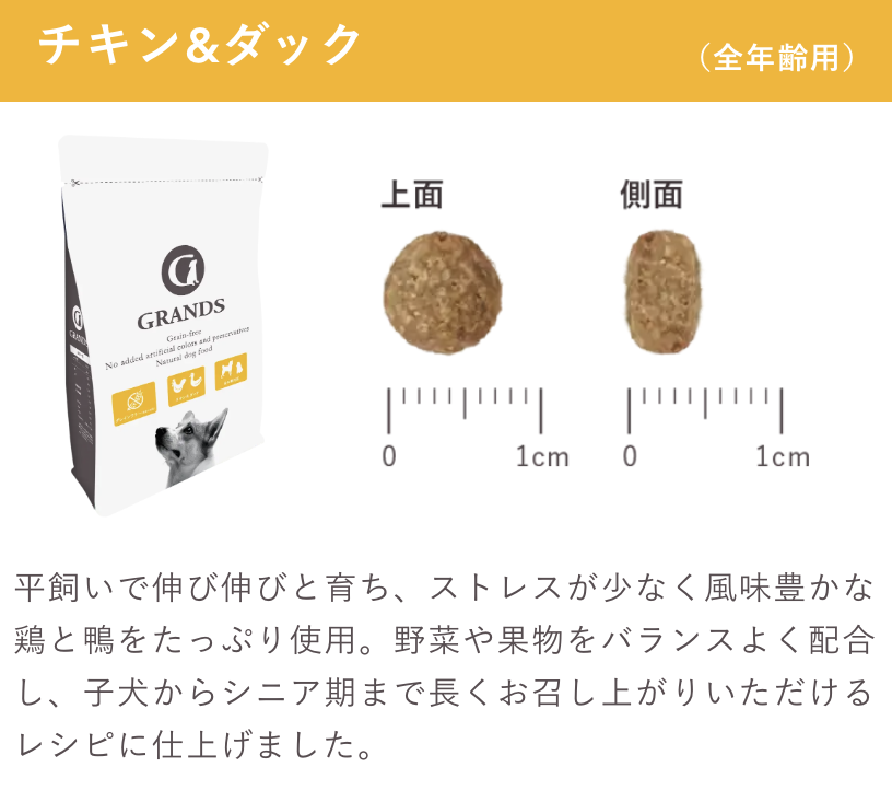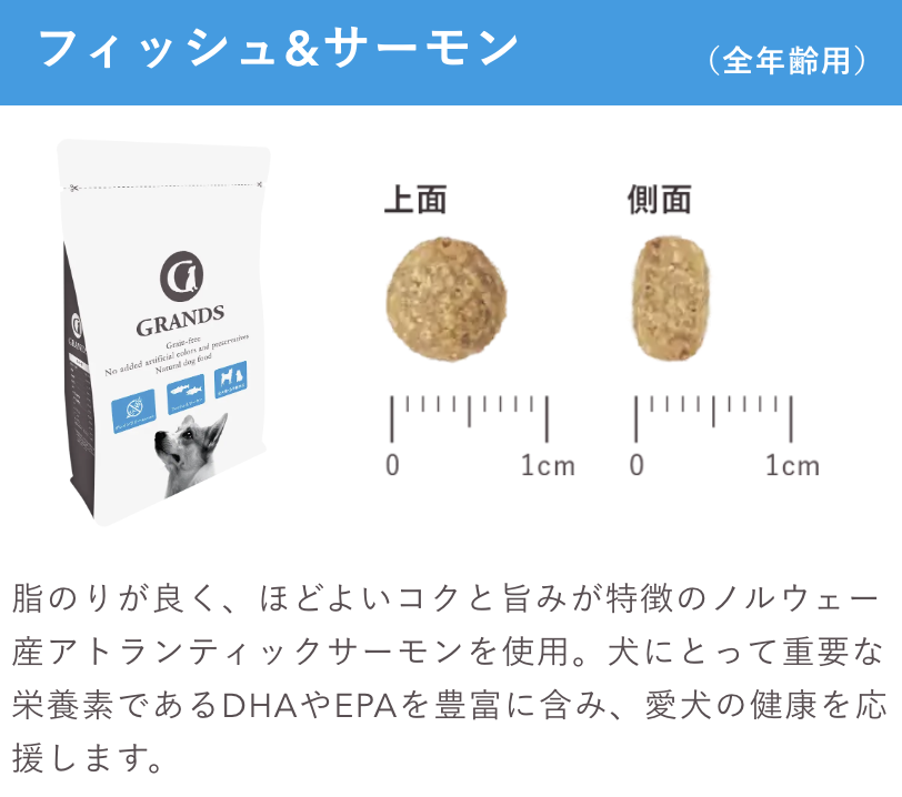 GRANDS(グランツ)のプレミアムドッグフードには、ローテーションできるようにフィッシュベースとチキン&ダックベースの2種類があります。